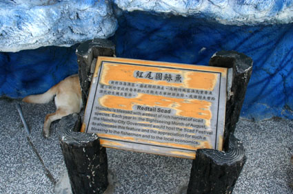 大魚前的名牌寫著紅尾圓鰺魚.