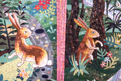 穿過城堡下,看到兩側牆壁上的拼貼馬賽克,是豐富的森林圖案~