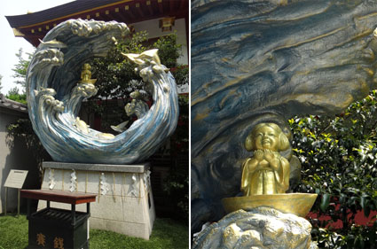 而被海浪包圍的意思,是描述惠比須神受到海裡海豚、鯛魚和飛魚的保護下,渡海的情景.