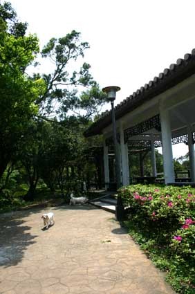 在這座四方亭的後方,還有一座假山湧泉,但很可惜無法讓斑斑去拍照,部是因為斑斑會跳水(其實她真的有點想),而是假山被一大群,帶著小板凳在泡茶的人給包圍了。