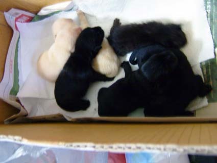箱子裡的小點點們共有6隻,2白4黑,其中黑的有2隻是母的,都好小又好可愛阿!眼睛、耳朵都這麼迷你,當然也都還沒有開.