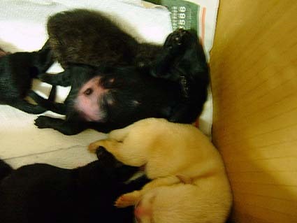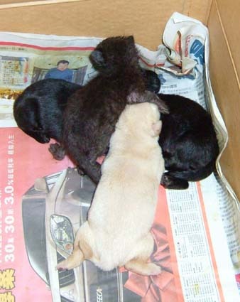 其中一隻在吃飽睡覺,當我輕輕摸一下時,雖然眼睛和耳朵都沒開,但仍是抬頭對著我"汪汪"兩聲,還很不爽的"嗚~~"了一下.