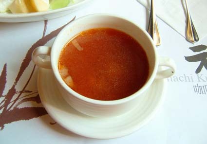 今天的湯品是清木瓜湯和番茄蔬菜湯.因為姑娘我不需要青木瓜來幫助發育,所以當然就選擇可以抗老化的番茄湯囉!湯裡面有洋蔥、紅蘿蔔、西洋芹和通心粉,喝起來的滋味不賴.