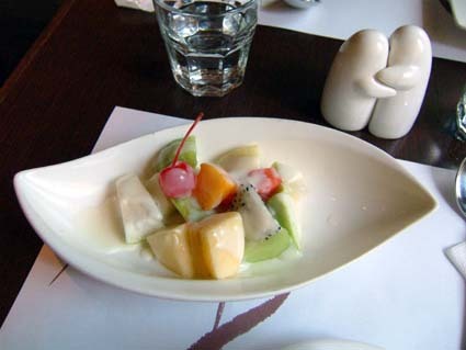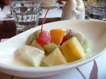 這是我的水果沙拉,裡面有香瓜、水蜜桃、奇異果、西瓜、香蕉、火龍果和櫻桃,配上優格酸酸甜甜的,相當爽口.