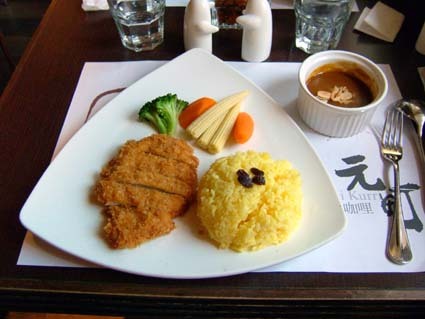 元町咖哩(地址:台北市南京西路13號2樓 電話:2531-2021 )位在衣碟二館的隔壁,標榜著橫濱歐風咖哩專門店.但是一樓的入口相當不起眼,可以搭電梯,或是爬有點詭異的樓梯到大門.
