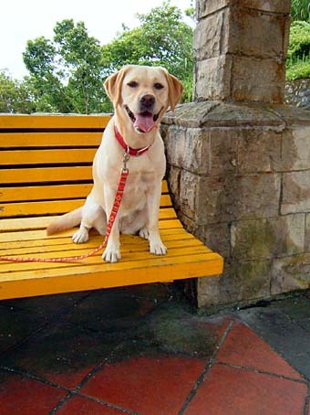 這時瞧見山坡上有一隻大黃狗,呵~球媽和阿球也趕到了。