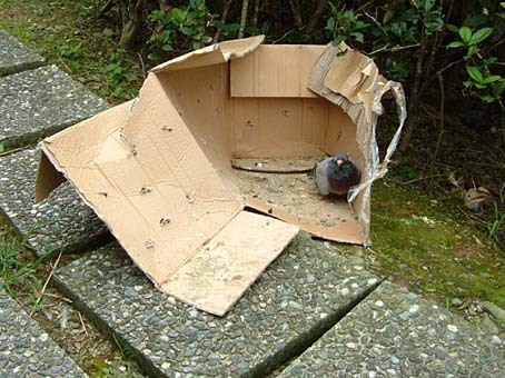 當我們前往涼亭的小徑時,突然從旁邊的樹叢傳來一陣騷動,斑斑也興奮地拼命往前衝。原來,在樹叢旁,有一個堆積了糞便的紙箱,箱中是一隻已經全盲的鴿子。而樹叢中的騷動,可以隱約看出還有其他鴿子的存在。