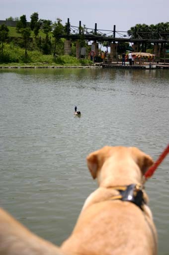 斑娘:喔!有綠頭鴨ㄝ!不過,你還是不可以游泳,更不可以追鴨子!!