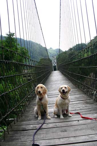 吊橋下清澈的溪水,早已讓大狗們興奮不已。
