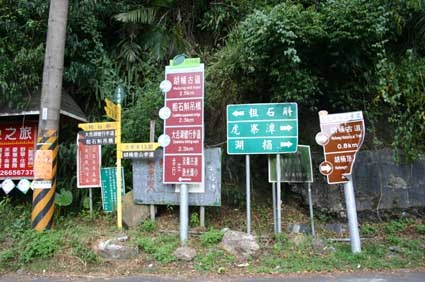 橋前還有許多指標,往右可以連接到胡桶古道,往左則是續往北勢溪的上游,就是粗石斛的方向。