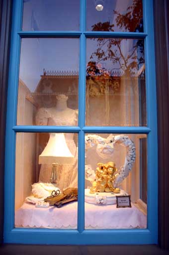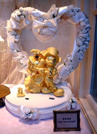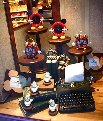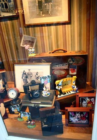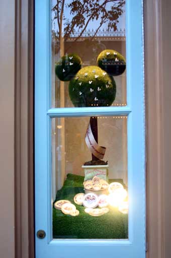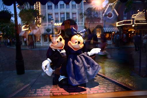 這是小鎮珠寶店的櫥窗,裡面展示著米奇和米妮的金雕.