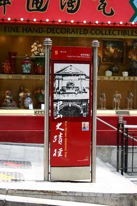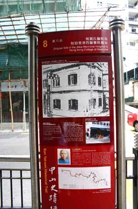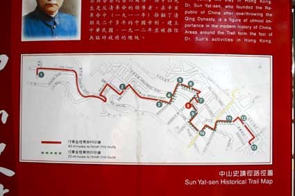 原來,「中山史蹟徑」是香港政府把孫中山先生曾經在香港中西區的主要活動地點串連起來,成為市民遊觀的據點.各據點都有特製的紅色解說牌,以中西文標註曾在這兒的活動內容.
