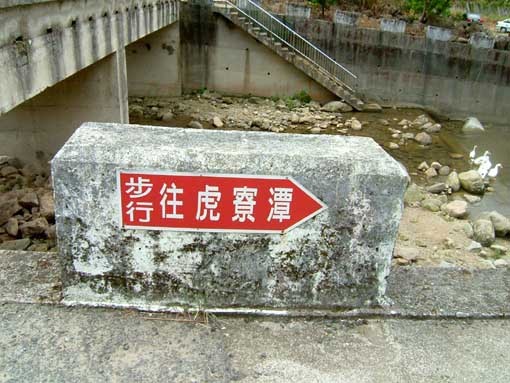 依石墩「步行往虎寮潭」的指標,和一旁「大舌湖健行步道、粗石斛吊橋」指標,我們沿著溪谷方向走.