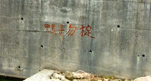 不過,在這個小溪兩側的水泥牆上,有一句話吸引了我的目光--鴨子勿捉!!