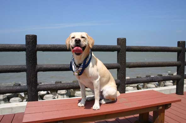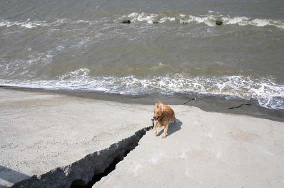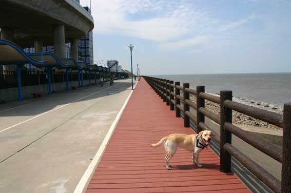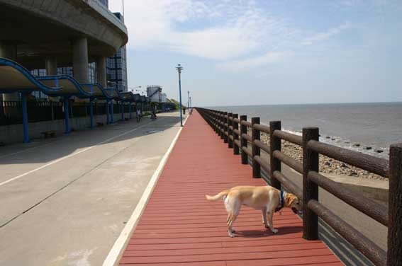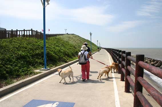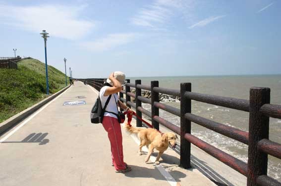 當一群人還在看海公園漫步著,一群狗在追逐奔跑的時候.忽然,狗子們如發現新大陸般的興奮,直直往一個方向衝去.目標,正是一個小平台後的階梯,而在階梯末端,穿越過自行車道,竄過圍欄,正是那波波誘狗的海洋.