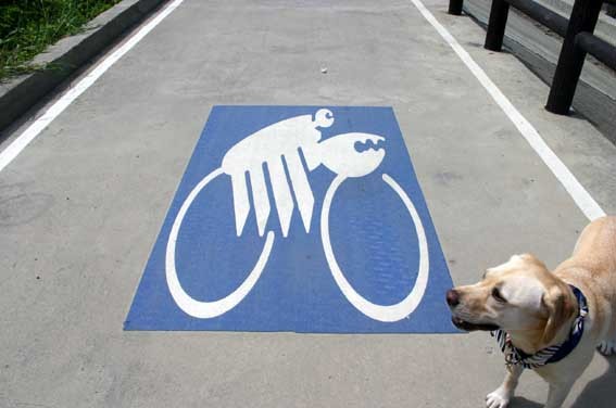 自行車道上的螃蟹騎車圖形,相當醒目逗趣.