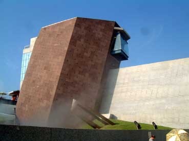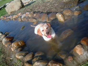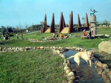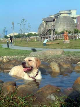 來到博物館的背面,是個描繪"大洪水"傳說的小河,天氣那麼熱,斑斑又哈水哈的要命,當然就撲通~撲通~給牠跳下去泡水啦...