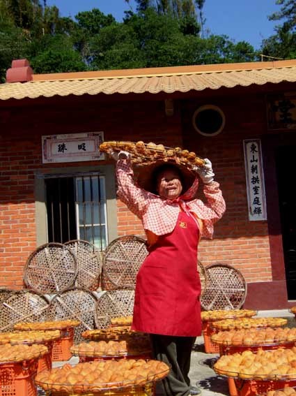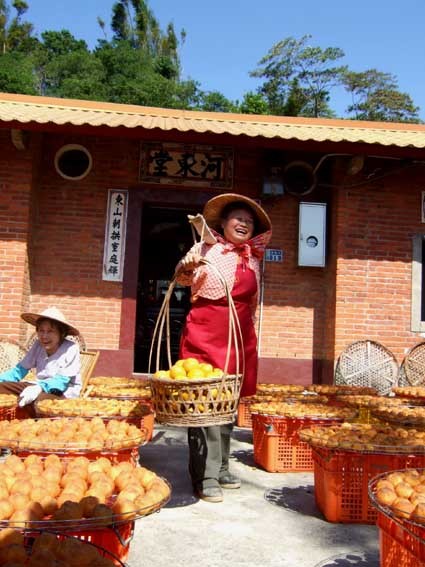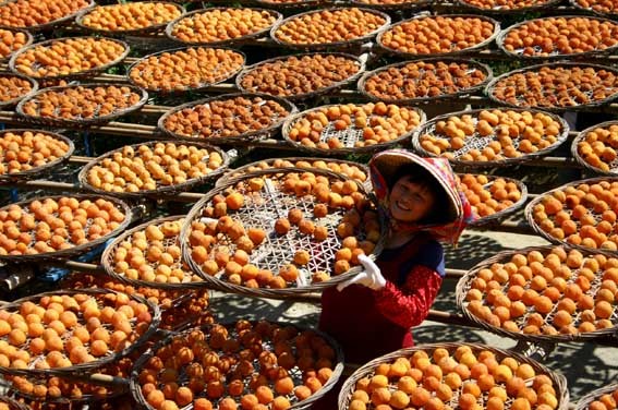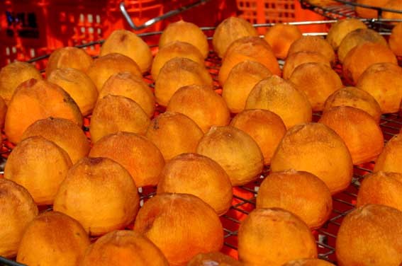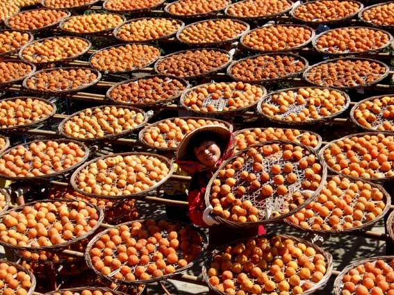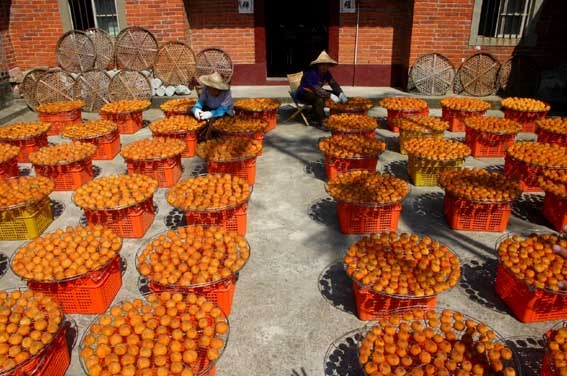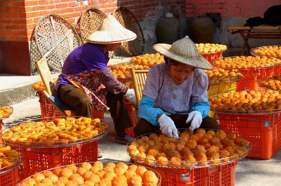 兩位老婦人無視於廣場邊無數的鏡頭,頂著頭上的大太陽,耐心地替一個個柿子翻身。