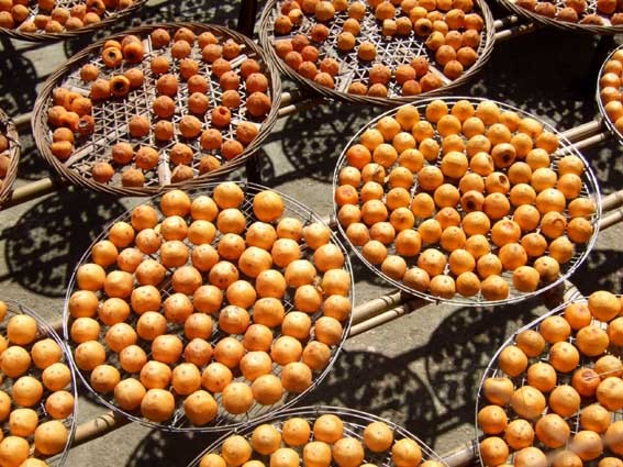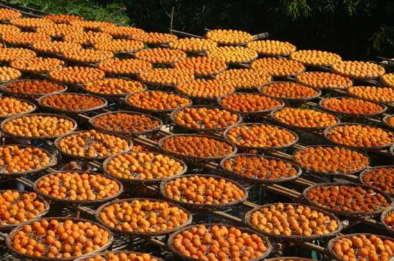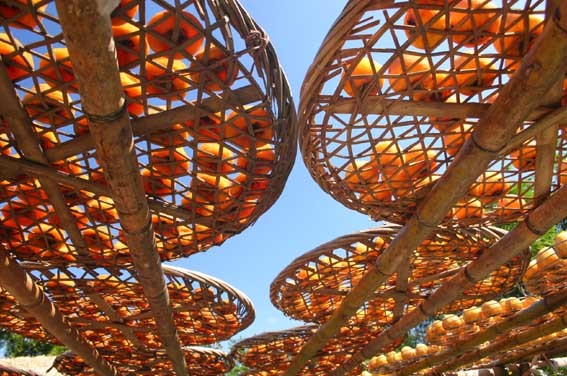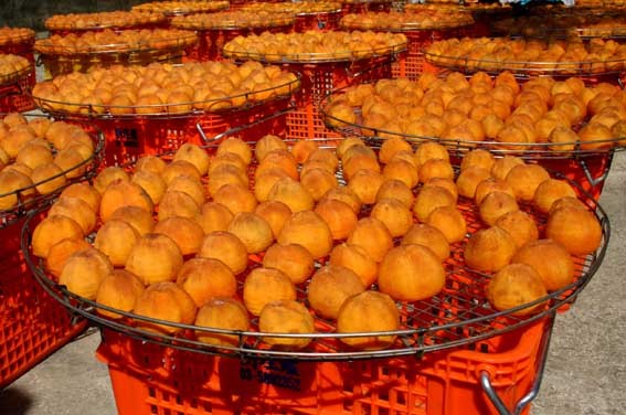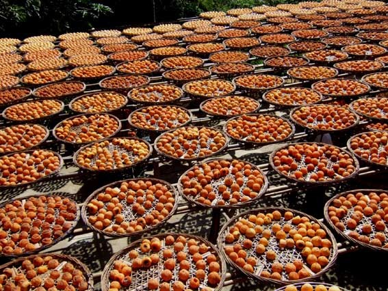 在一個狀似老舊三合院的屋前廣場,一片片竹篩子上擺放著的,就是那正在以陽光烘培的柿子。