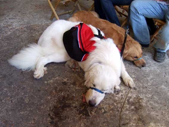 這是一家子,有大白熊和黃金獵犬。天氣熱的他們把大舌頭掛一旁,喘阿喘的。