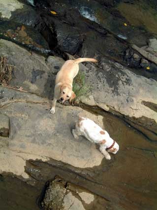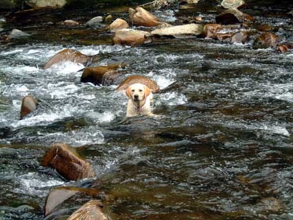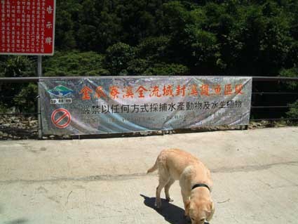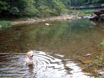 斑斑後來嫌平坦的溪面不好玩,居然跑到石堆中衝來衝去,還不太想回來...