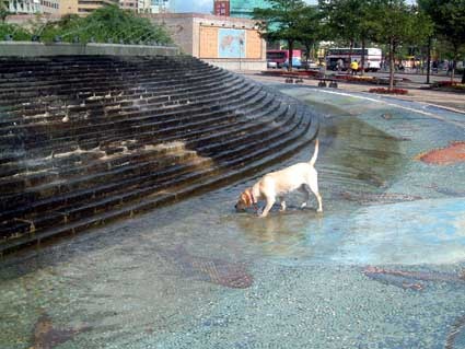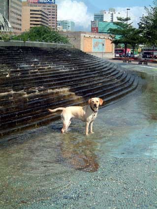 不過,既然來都來了,就讓斑斑踩踩市政府前的噴水池再走吧!