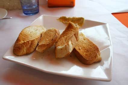在點餐後的20分鐘,服務生終於又有了動作,送上4片烤得有點焦黃的麵包.