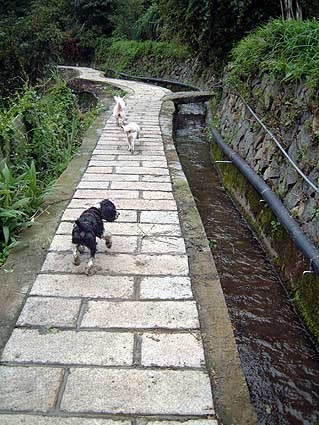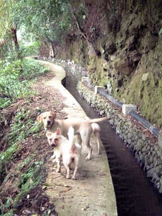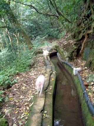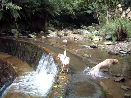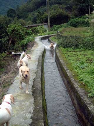 狗狗們都走在古圳旁的水泥地上,還來回穿梭,忙的很!