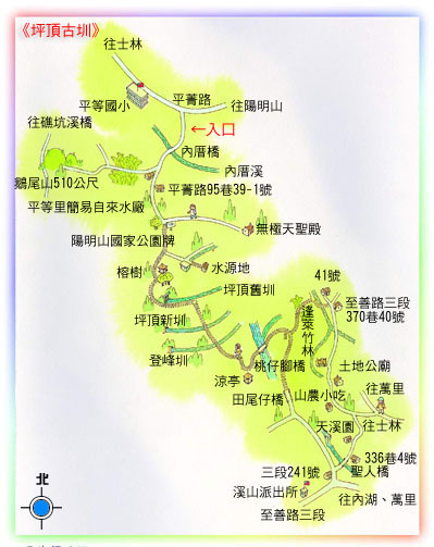 但據查詢到的資料顯示,其他可以前往坪頂古圳的路徑為:至善路三段371巷底 (第1號登山口) 、370巷 (萬溪左線產業道路、第2號登山口) 或平菁街95巷 (第3號登山口) .