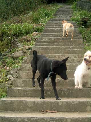 走在中途,一農舍養有公的大狼狗,攻擊性強,活得不耐煩的牠居然要咬我家的寶貝,讓我家的狗被嚇得慘叫..於是,牠就被二人很狠圍毆一頓..