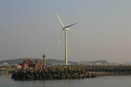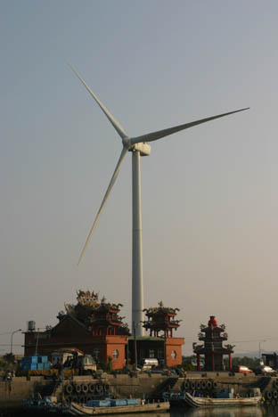 漁港邊還有幾座風車,矗立在傳統廟宇後,形成現代與傳統的強烈對比.