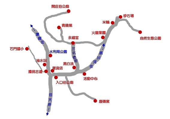從北二高龍潭交流道下,往石門水庫的方向前進.經過老爸後花園前直行,穿一個過大十字路口後,注意左側小路口有個雜貨店,這就是通往三坑村的唯一道路啦!!