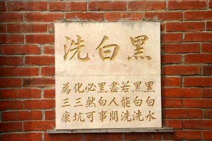水池前一個牌語寫著:「黑白水˙黑白洗,若能洗盡人間黑白事,必然可化三坑為三康」
