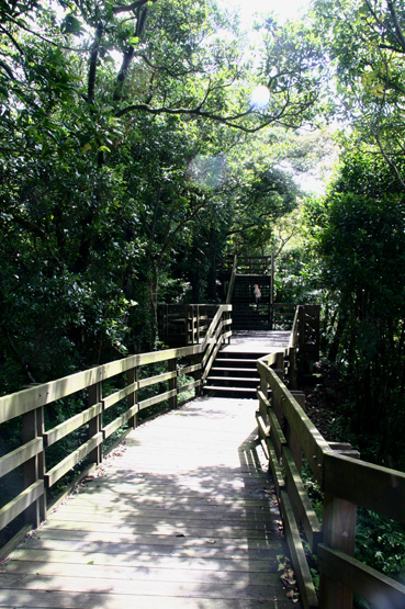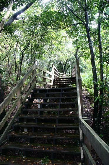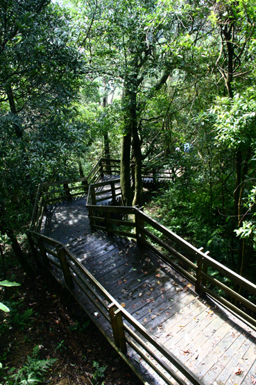 這邊的步道還有一個特點,就是依著山勢和林間築起的木道,不是一長條的直線,而是有寬有窄,有平台有階梯,互相錯置組合而成的.