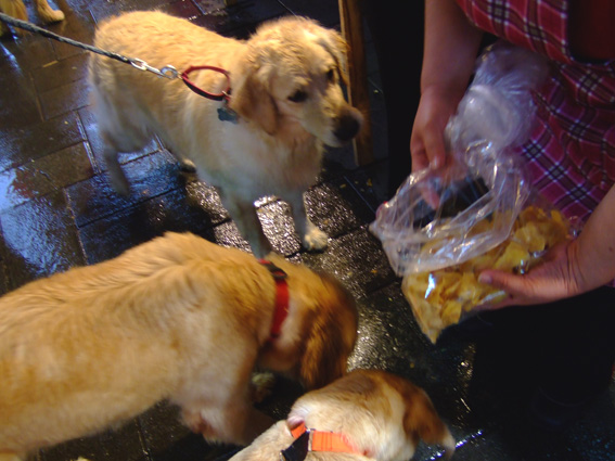 最重要的,是阿婆不但不嫌狗狗靠近,還不停地拿一包包番薯片出來給狗子們吃!!!