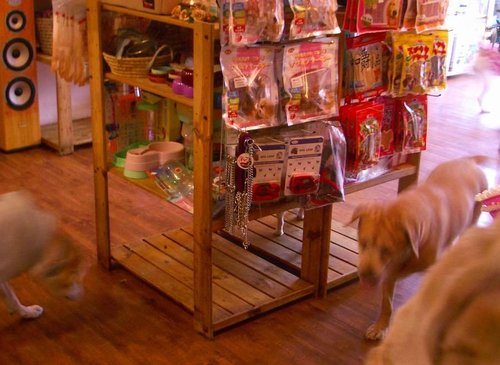 為了讓狗子們自在的跑動,貨架底下通通清空,隱約還可看到兩隻腳在那XD