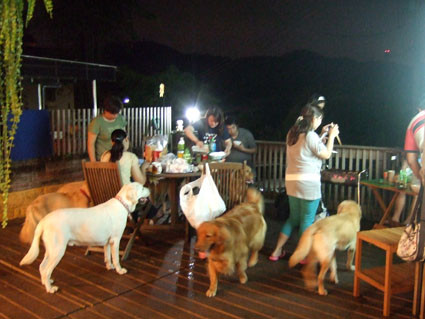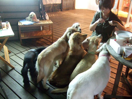 稍微放涼後,狗子們全部圍過來,而且,都是貪吃的大狗.