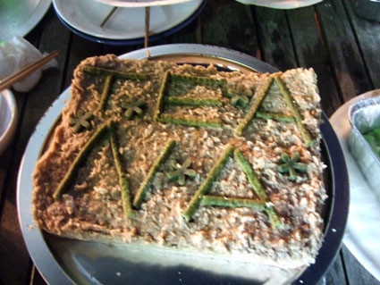 這是我前一晚烤的羊肉蛋糕,上面用肉條寫著茶茶和娜娜的名字.