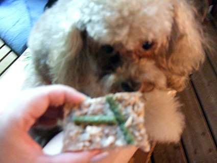 小小一塊蛋糕,大狗一吞就沒了,但茶茶卻啃了好久.