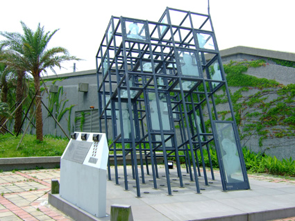 在樓梯的旁邊,有一個以鋼架做成的藝術品,在玻璃上面刻劃的人物,都是跟客家音樂有關的人.