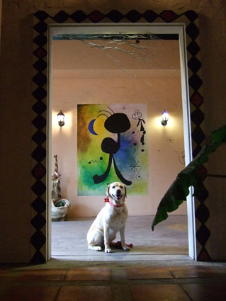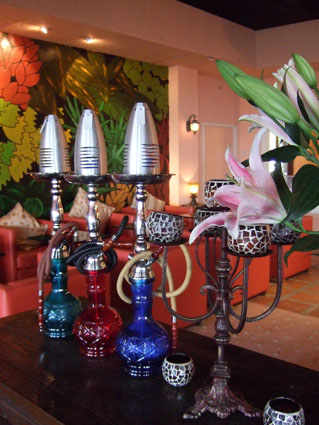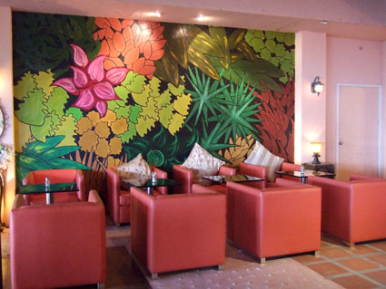 即使此區以沙發為主,但這邊以卻紅色的沙發配上色彩強烈的壁畫,是熱情奔放的~