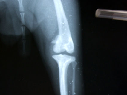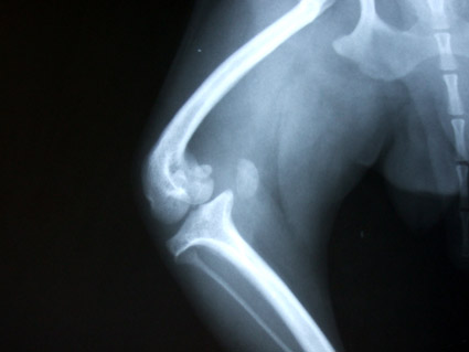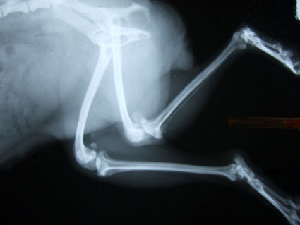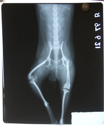 變形的左後腿,兩隻腳骨已呈現90度扭轉變形,韌帶也完全萎縮.