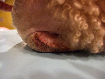 這就是茶茶膝關節的傷口,本來醫生縫的是不用拆線的手法,傷口是非常漂亮低.