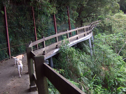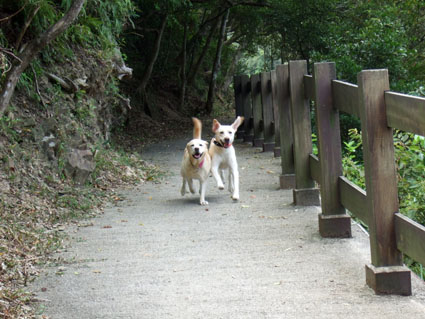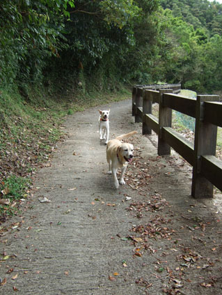 在往回程的途中,只見大狗們來回依著欄杆搜尋.