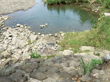 而石階末端的水潭中,就是吾家大狗的身影!!