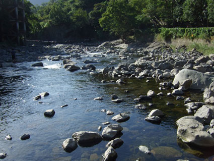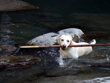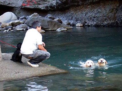 走到瀑布下方的溪畔,戲水的人群已不多,可以讓狗兒玩的更起勁~